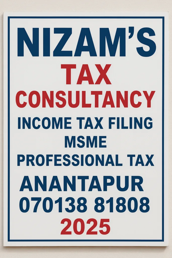 🏢 Nizam’s Tax Consultancy – ఆదాయపు పన్ను, MSME & ప్రొఫెషనల్ టాక్స్ సేవలు – అనంతపూర్ 2025