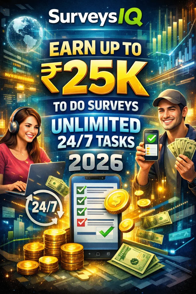 SurveysIQ earn upto 25k to do serveys unlimited 24/7 task 2026ఇంటర్నెట్ యుగంలో ఇంట్లో కూర్చునే డబ్బు సంపాదన (Work From Home) అనేది చాలా మందికి ప్రధాన లక్ష్యంగా మారింది. ముఖ్యంగా విద్యార్థులు, గృహిణులు, ఉద్యోగులు, రిటైర్డ్ వ్యక్తులు అందరికీ సరిపోయే మార్గం కావాలంటే – ఆన్‌లైన్ సర్వేలు ఒక మంచి ఎంపిక.