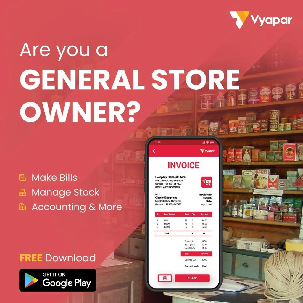Vyapar Billing Software ಭಾರತದಲ್ಲಿನ ಎಲ್ಲಾ ರೀತಿಯ ವ್ಯಾಪಾರಿಗಳಿಗೆ (ಕಿರಾಣಿ, ಬಟ್ಟೆ ಅಂಗಡಿ, ಎಲೆಕ್ಟ್ರಿಕಲ್, ಹಾರ್ಡ್ವೇರ್, ಮೊಬೈಲ್ ಶಾಪ್, ಹೋಟೆಲ್ ಇತ್ಯಾದಿ) ಉಪಯೋಗವಾಗುವ ಸರಳ ಮತ್ತು ಶಕ್ತಿಶಾಲಿ ಅಪ್ಲಿಕೇಶನ್ ಆಗಿದೆ.
