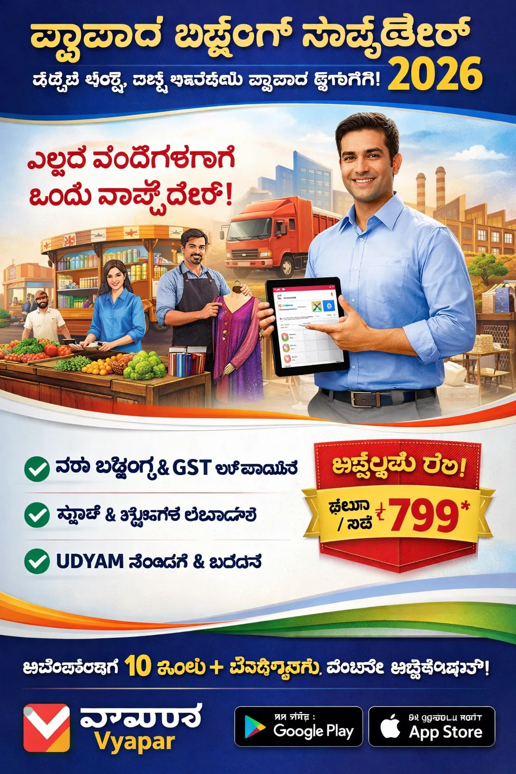 vyapar billing software best price all types of indian businessವ್ಯಪಾರ್ ಬಿಲ್ಲಿಂಗ್ ಸಾಫ್ಟ್ವೇರ್ (Vyapar Billing Software) ಎಂಬುದು ಸಣ್ಣ ಹಾಗೂ ಮಧ್ಯಮ ವ್ಯಾಪಾರಗಳಿಗೆ ವಿನ್ಯಾಸಗೊಳಿಸಲಾದ ಸುಲಭ ಮತ್ತು ಪರಿಣಾಮಕಾರಿ ಲೆಕ್ಕಪತ್ರ ಹಾಗೂ ಬಿಲ್ಲಿಂಗ್ ಅಪ್ಲಿಕೇಶನ್ ಆಗಿದೆ. ಈ ಸಾಫ್ಟ್ವೇರ್ ಮೂಲಕ ವ್ಯಾಪಾರಿಗಳು ತಮ್ಮ ದಿನನಿತ್ಯದ ವ್ಯವಹಾರಗಳನ್ನು ಡಿಜಿಟಲ್ ರೀತಿಯಲ್ಲಿ ನಿರ್ವಹಿಸಬಹುದು. ಬಿಲ್ಲು ತಯಾರಿಕೆ, ಮಾರಾಟ ಮತ್ತು ಖರೀದಿ ದಾಖಲೆಗಳು, ಸ್ಟಾಕ್ ನಿರ್ವಹಣೆ, ತೆರಿಗೆ ಲೆಕ್ಕಾಚಾರ (GST), ಗ್ರಾಹಕ ಮತ್ತು ಸರಬರಾಜುದಾರರ ವಿವರಗಳನ್ನು ಒಂದೇ ವೇದಿಕೆಯಲ್ಲಿ ಸುಲಭವಾಗಿ ನೋಡಿಕೊಳ್ಳಬಹುದು.
